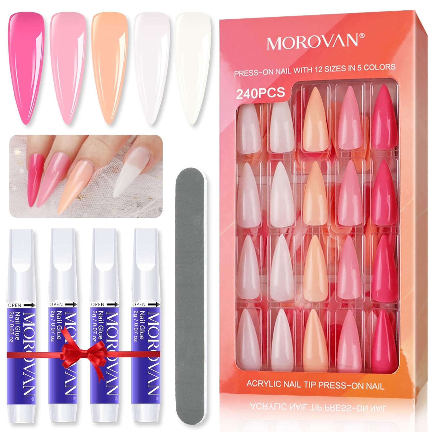 Amazon Com Morovan Fake Nails Acrylic Nail Tips Kit 5 Colors False Nails With Glue Long Stiletto Press On Nails Full Cover French Nails 10 Sizes Nail Glues Nail File With Case