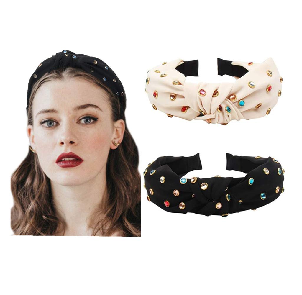 Knotted Headbands For Women Hair Twist Rhinestone Top Knot 2pcs Wide Band Fashion Cute Studs Hair Hoop Headbands For Adult Girl Vintage Hairband
