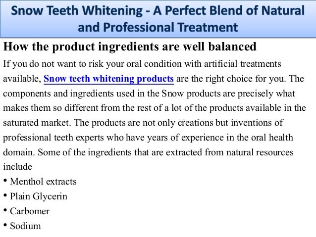 How Does Snow Compare to Whitening Strips. Hydrogen peroxide Carbamide peroxide Glycerol Deionized water Sodium bicarbonate Carbomer Potassium nitrate Peppermint oil. Snow Teeth Whitening is good news for you if you experience dentin hypersensitivity.